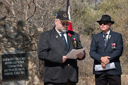 ![]() | ![]() Frank Keller, Escarpment Shellhole, Walvis Bay, reading an address from Johan Knoetze, M.O.T.H. (Windhoek Command) | ![]() Hasso Gantze of Traditionsverband ehemaliger Schutz- und Überseetruppen – Freunde der früheren deutschen Schutzgebiete e.V |